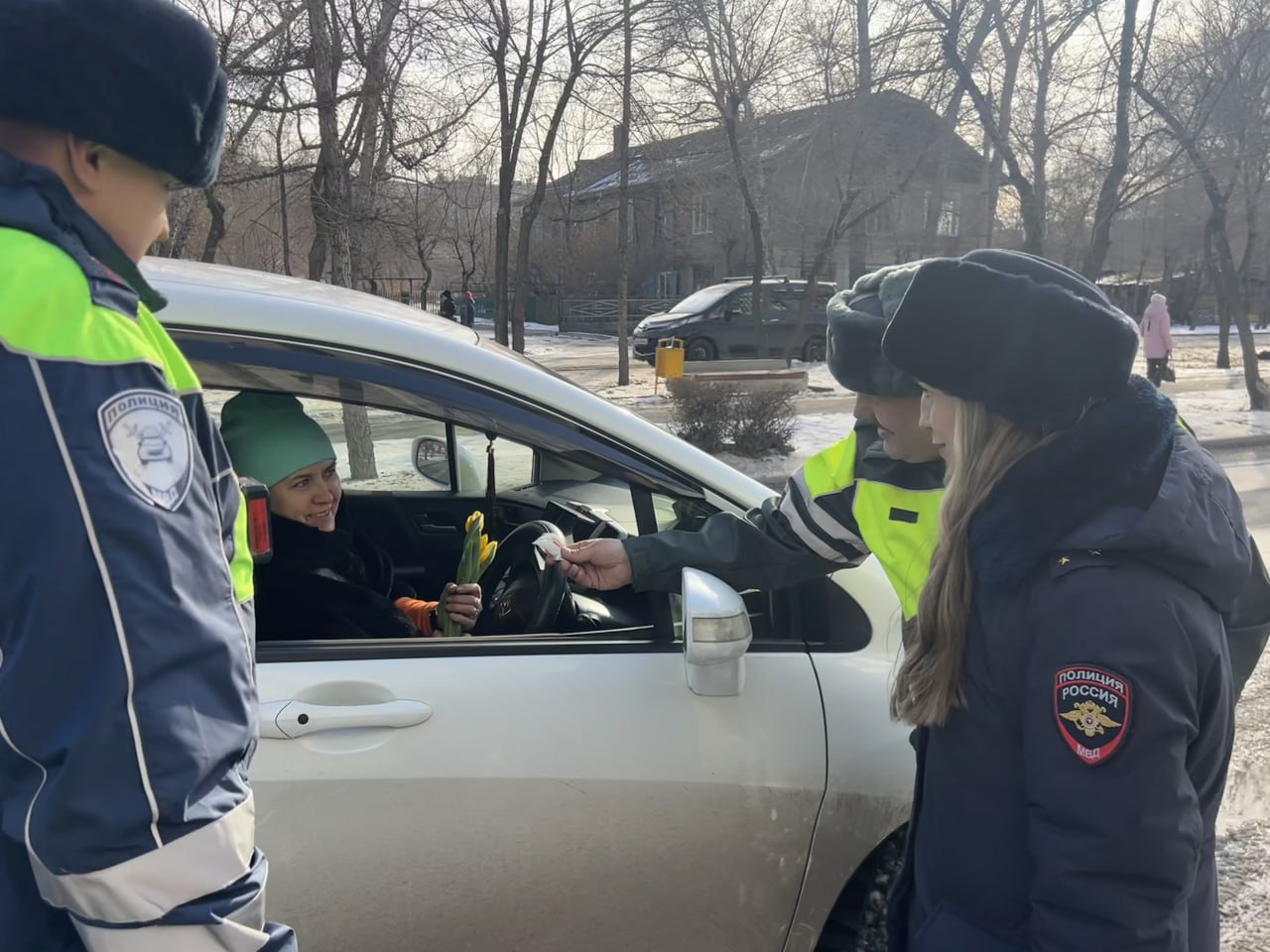 В рамках Всероссийской акции «Цветы для автоледи» сотрудники Госавтоинспекции Хакасии поздравили женщин-водителей с наступающим Международным женским днём