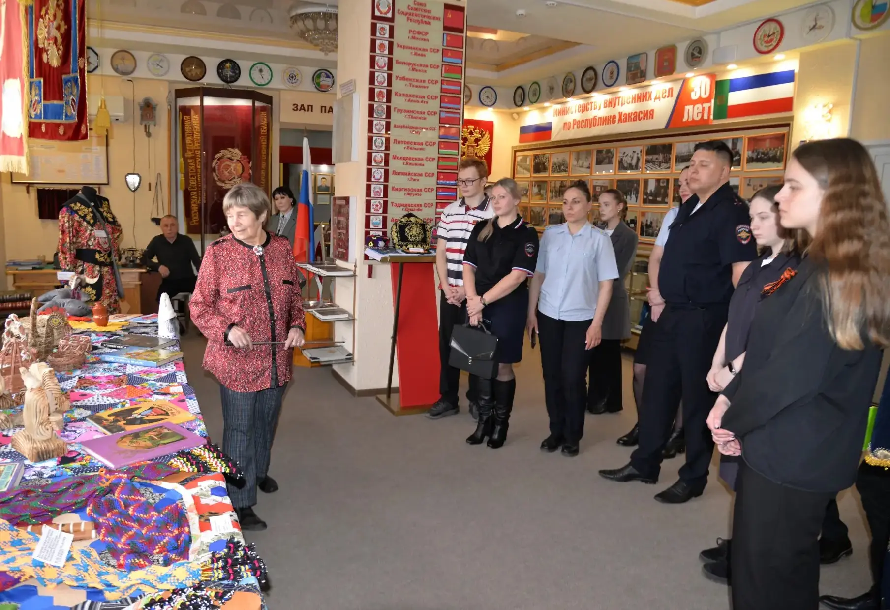 Перед началом мероприятия для всех участников диктанта увлекательную экскурсию по экспозициям Музея истории органов внутренних дел Хакасии провела член Общественного совета при республиканском МВД Нина Капустина . Она познакомила присутствующих с основными историческими датами становления Министерства .