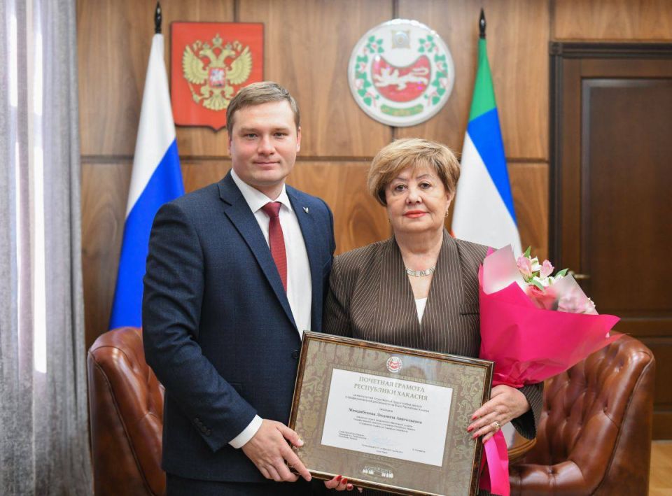 Глава Хакасии Валентин Коновалов вручил Почётную грамоту Республики Хакасия Людмиле Анатольевне Миндибековой за многолетний плодотворный труд и особые заслуги в профессиональной деятельности на благо республики.Людмила Анатольевна является...