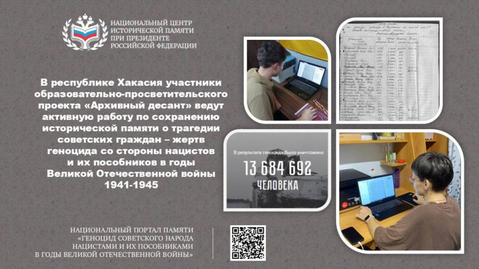 Проект направлен на сохранение исторической памяти о событиях, связанных с геноцидом советского народа нацистами и их пособниками в годы Великой Отечественной войны.К модерации архивному десанту Хакасии выделены архивные документы, отражающие события...