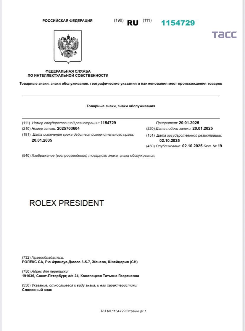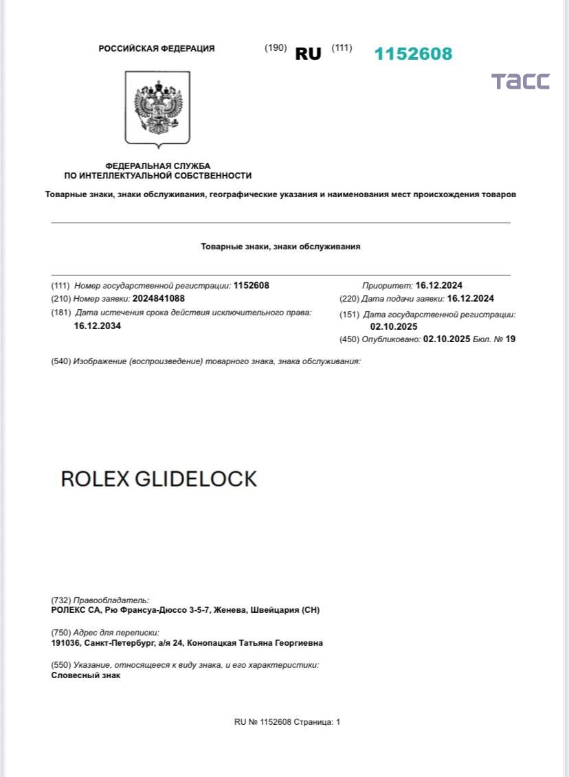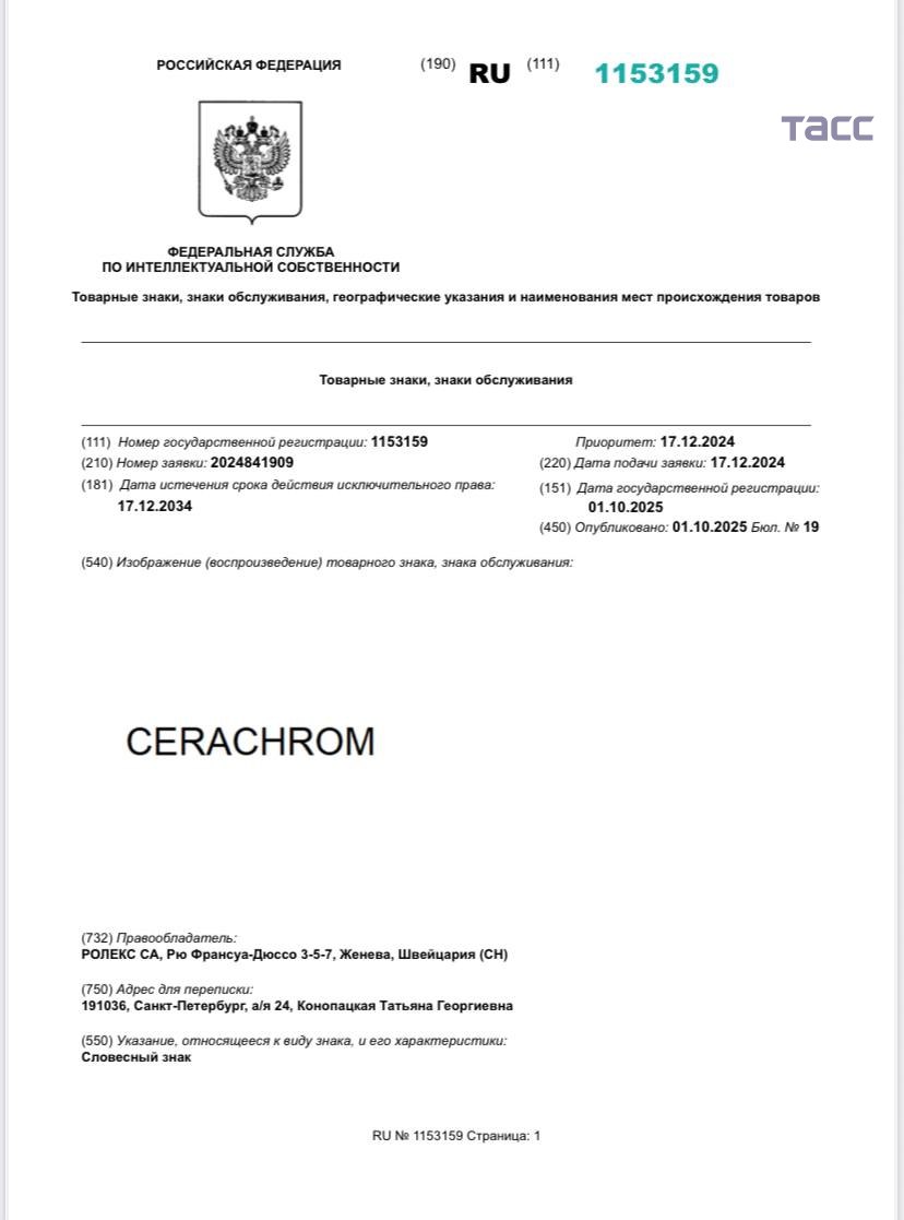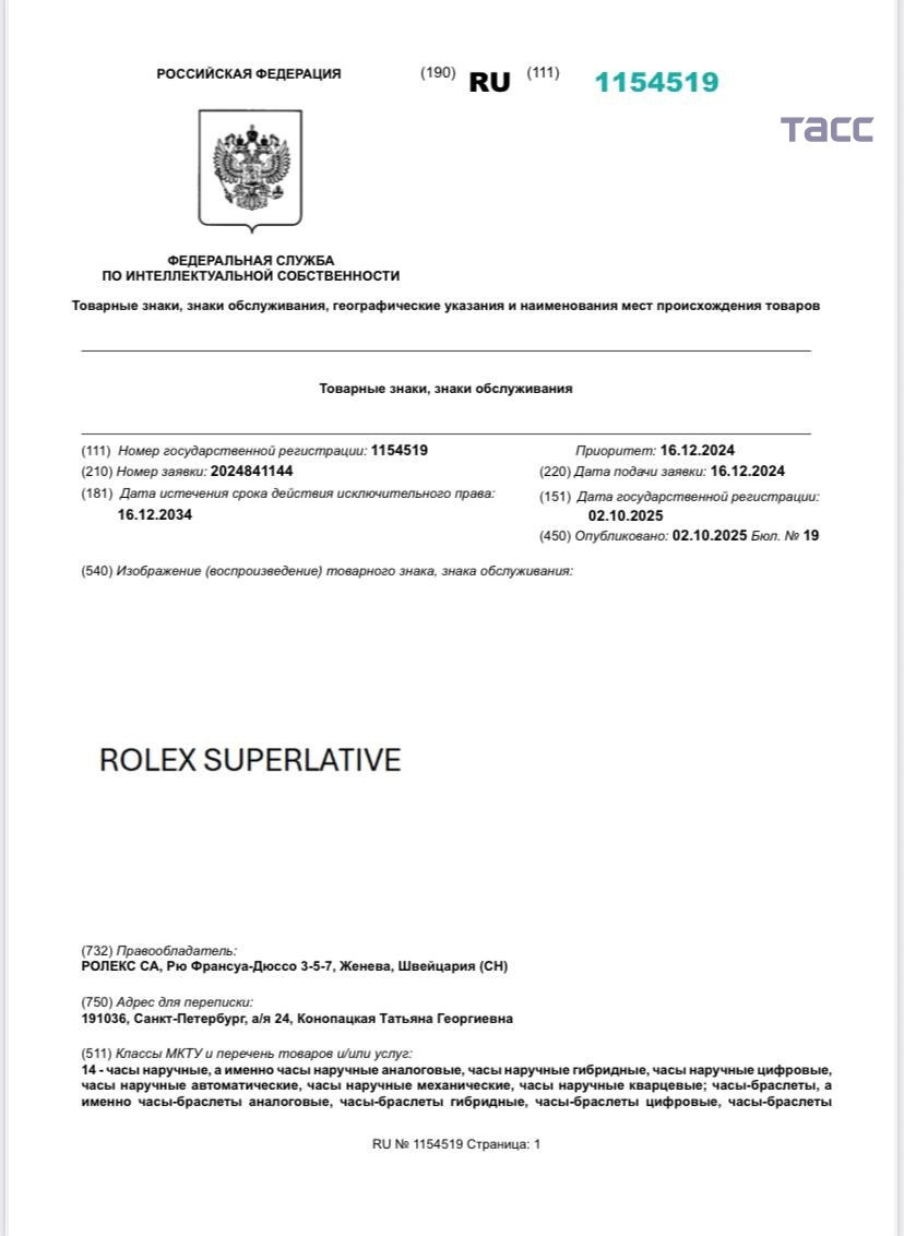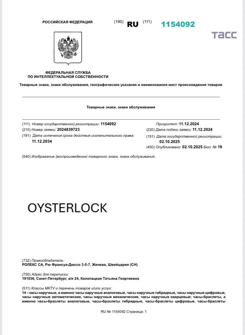 Rolex подал в Роспатент более 50 заявок на регистрацию товарных знаков с 2023 года. Такие данные следуют из подсчетов корреспондента ТАСС.