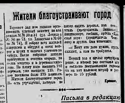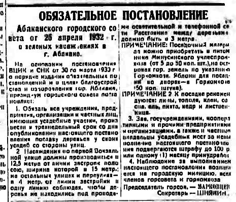 В газете «Советская Хакассия» 9 мая 1932 года опубликовано постановление: «…произвести в трёхнедельный срок весеннюю посадку деревьев у своих усадеб со стороны улиц, а также во дворах. Должно быть засажено не менее 10% занимаемой площади. Посадка должна быть произведена тщательно и ограждена от уничтожения скотом. Все погибшие весенние посадки осенью должны быть заменены новыми. Расстояние между деревьями 3 метра в одну линию. К посадке рекомендуются: липы, тополя, клен, сосна, ель, пихта, кедр и лиственница. Посадочный материал можно приобретать в Минусинском питомнике (от 5 до 50 коп. за штуку)». За невыполнение — штраф и другие наказания.»