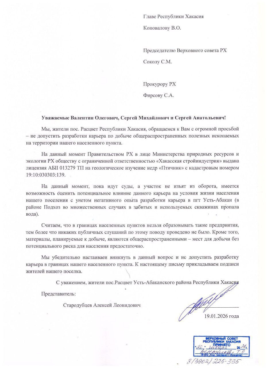Также отмечается, что районные власти и сами сельчане не поддерживают идею такого соседства. Люди опасаются повторения ситуации, которая ранее произошла в микрорайоне Подхоз Усть-Абакана, где при разработке похожего карьера пропала вода в колодцах и скважинах.