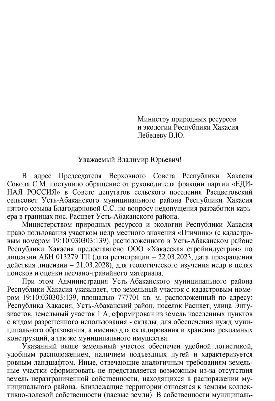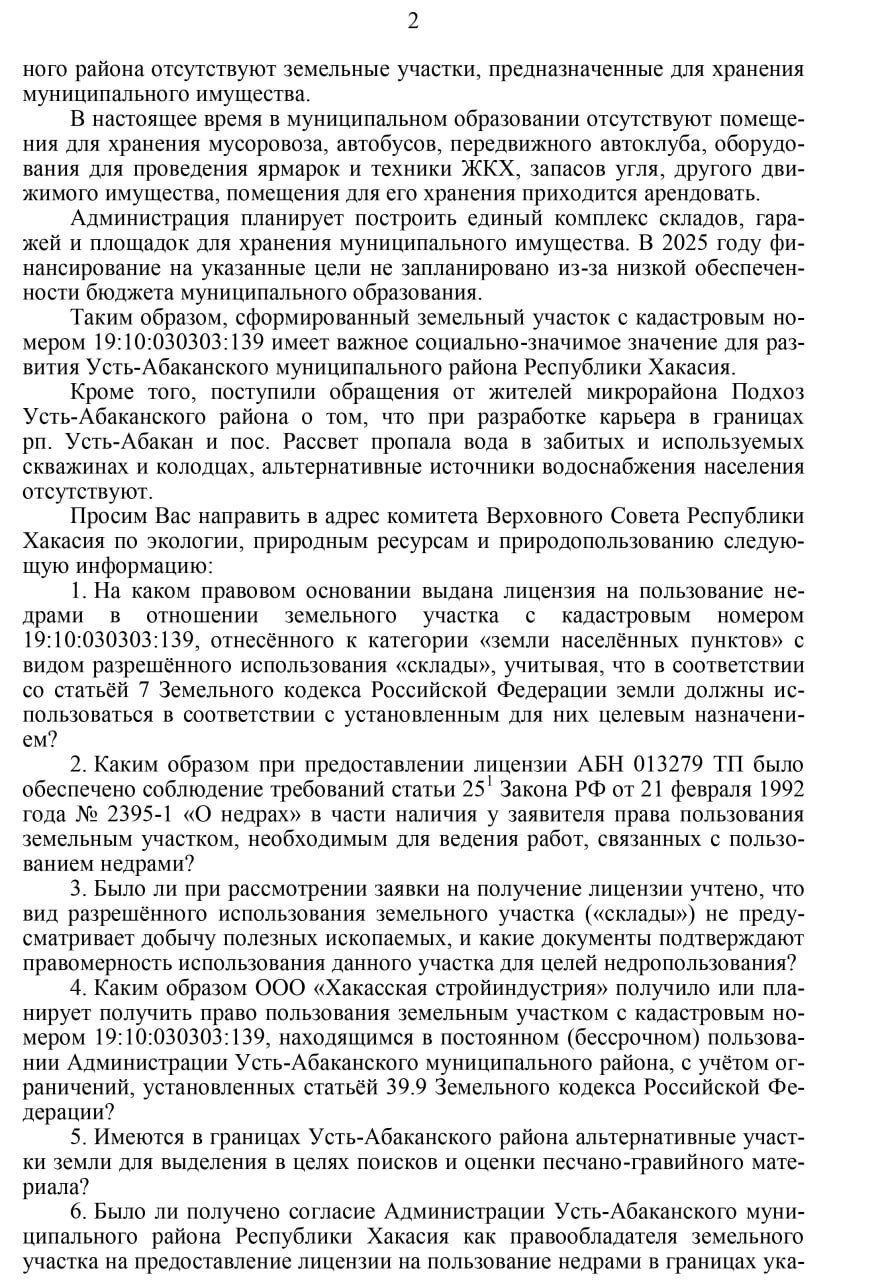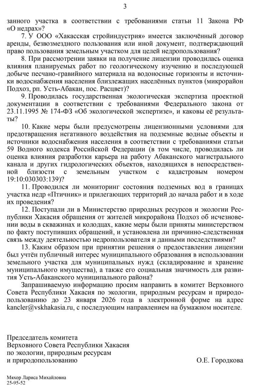 По словам Ольги Городковой, вопрос прорабатывается с декабря прошлого года. Участок недр «Птичник» был предоставлен компании «Хакасская стройиндустрия» для поиска и оценки ПГС, однако земля относится к категории земель населённых пунктов. Ранее район планировал использовать её под склады для муниципальных нужд. Комитет уже направил запрос в Минприроды Хакасии, ответ ожидается 23 января.