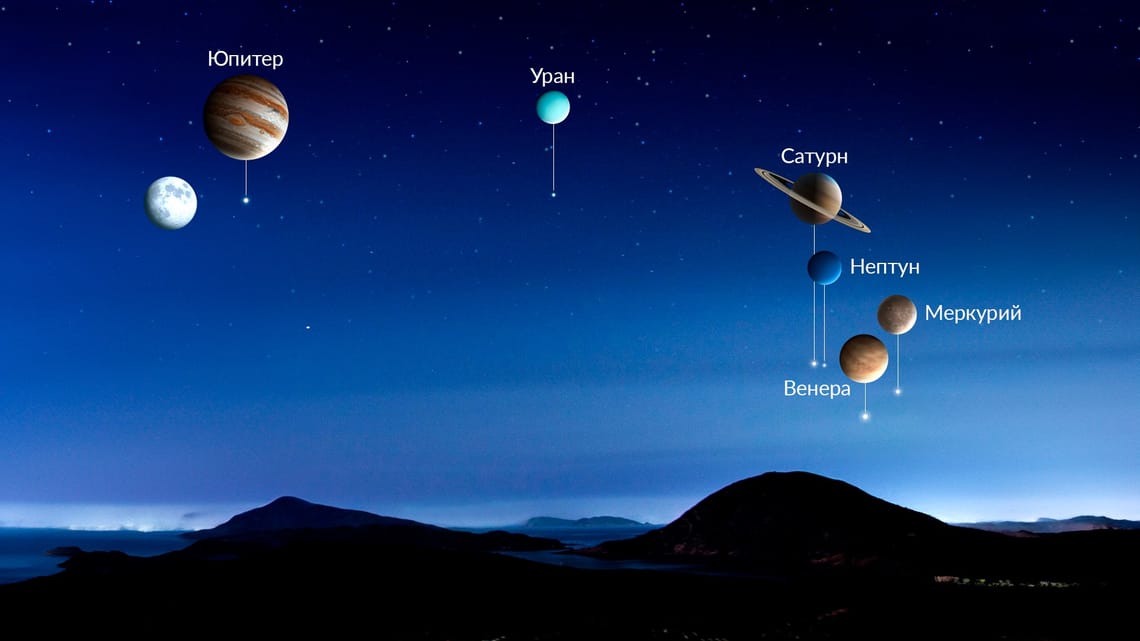 Меркурий, Венера, Юпитер, Сатурн, Уран и Нептун выстроятся в линию на восточной части горизонта. Причем 4 планеты можно будет наблюдать невооруженным глазом, а вот для Урана и Нептуна понадобятся бинокль или телескоп