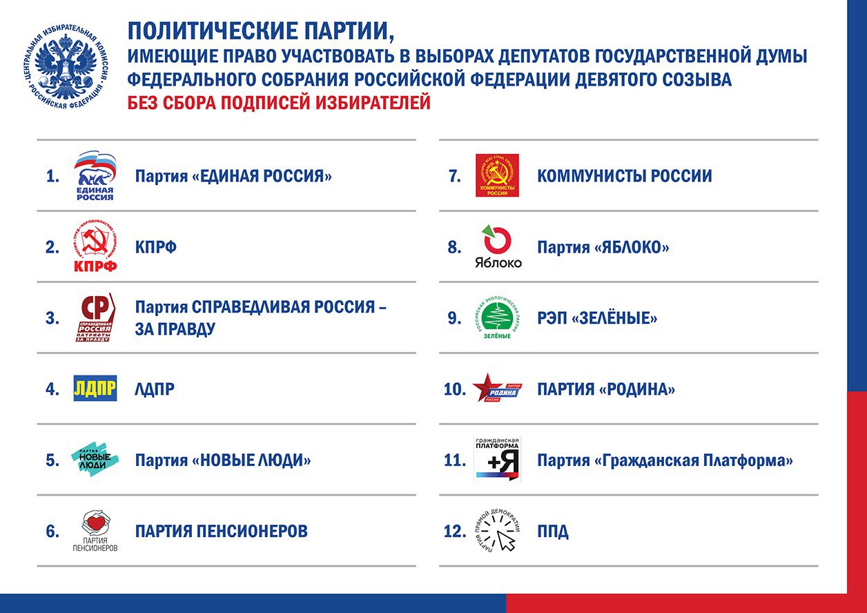 Вот что интересно. В списке 12 партий.Но на прошлых выборах в Думу 5% барьер голосов избирателей преодолели списки кандидатов только от 5 партий: «Единая Россия», КПРФ, ЛДПР, «Справедливая Россия — Патриоты — За правду», «Новые люди».