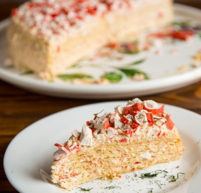 4. Верхнюю часть торта смажьте майонезом и украсьте нарезанными крабовыми палочками. Дайте закуске немного настояться в холодильнике — минимум 2-3 часа, а лучше оставьте на ночь.