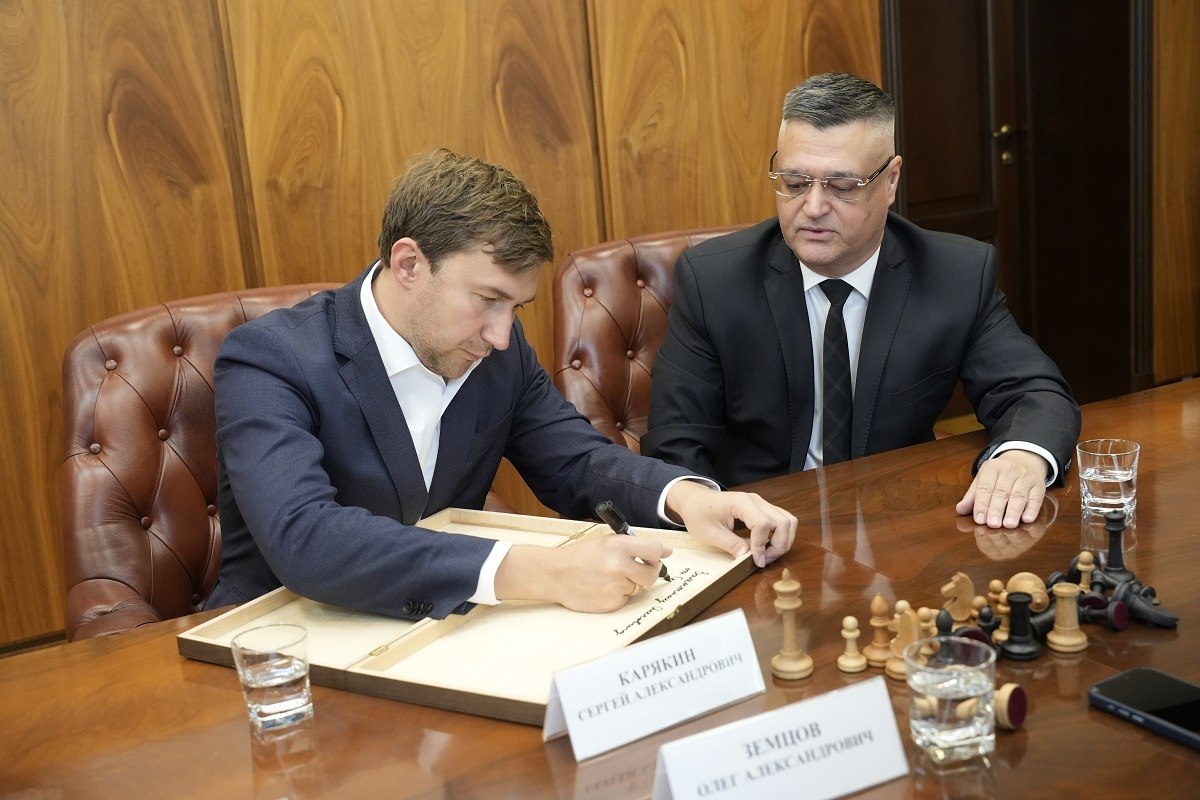 Прошлой осенью Сергей Карякин приезжал в Хакасию, когда открывал в абаканском Лицее имени Н.Г. Булакина шахматный клуб своего имени. Это всероссийский проект. Руководит им, а также множеством других проектов Альберт Миннуллин, исполнительный директор Федерации шахмат Московской области. Сегодня он тоже участвовал во встрече вместе с сенатором от правительства Хакасии в Совфеде Олегом Земцовым.