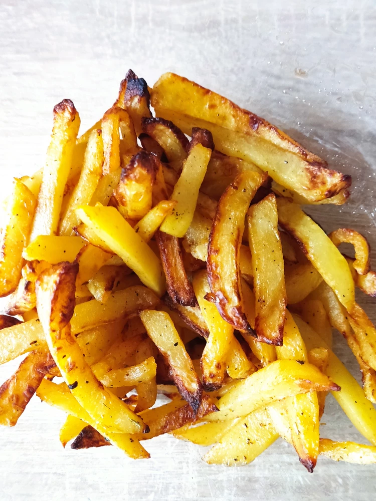 Не забудьте тщательно промыть нарезанные куски — это поможет избавиться от лишнего крахмала. Наилучший способ подготовки: залить картошку кипятком на 10 минут, после чего промыть холодной водой. Затем дайте картофелю обсохнуть на полотенце, чтобы он стал более хрустящим при жарке.