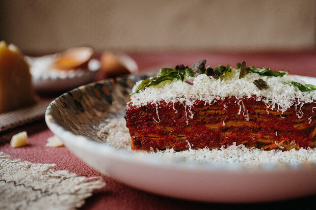 Когда все компоненты готовы, блинная лазанья собирается слоями: блины, мясное рагу и соусы. Запекаются все слои в духовке, чтобы получить хрустящую корочку и множество вкусовых оттенков.