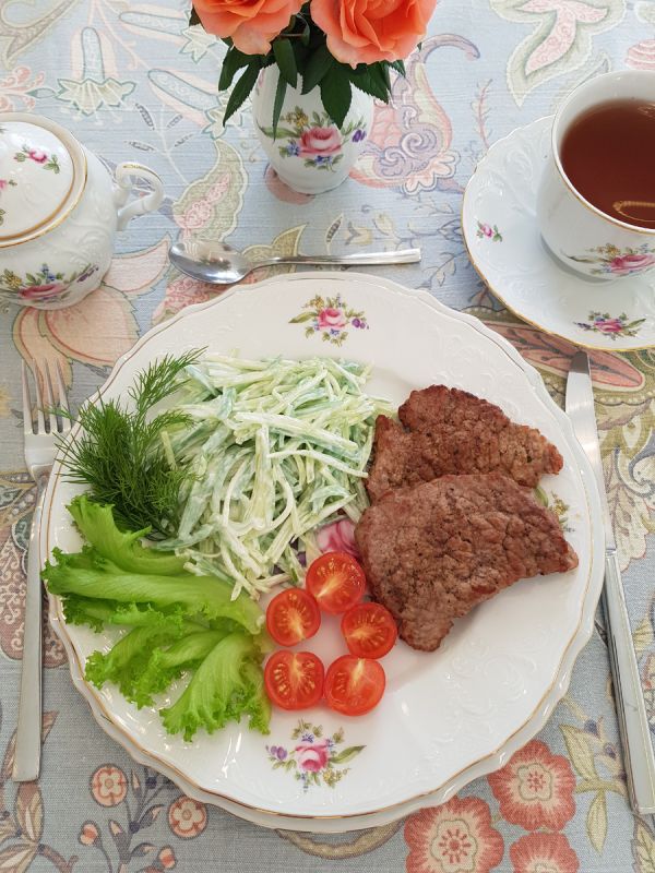 После того как мясо достигнет идеальной готовности, выложите его на тарелку рядом с освежающим салатом. Для дополнительного декора можно использовать свежую зелень и помидоры черри. Приятного аппетита!