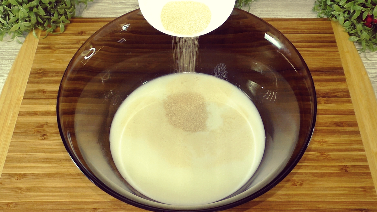 Начинается процесс с подогрева молока, после чего его необходимо перелить в большую миску и добавить также теплый кефир. Затем добавляется половина общего объема сахара. Дрожжи (сухие или прессованные) аккуратно всыпают в смесь и тщательно перемешивают, оставив в стороне для активации.