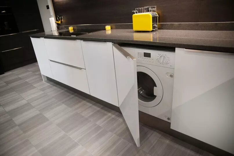 - Встраиваемые решения: Современные стиральные машины можно встроить в кухонные гарнитуры, что не только эстетично, но и защищает технику от влаги и повреждений.