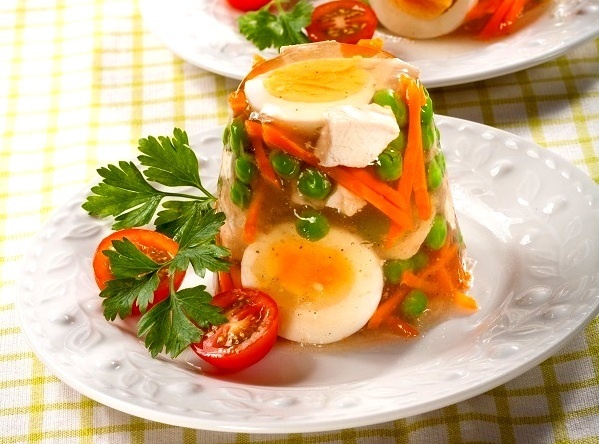 - Заливная куриная грудка: Для этого блюда понадобятся филе курицы, яйца, зеленый горошек и морковь. Готовят его, отварив курицу в бульоне, затем добавляют яйца и овощи, заливают желатином и настаивают в холодильнике.