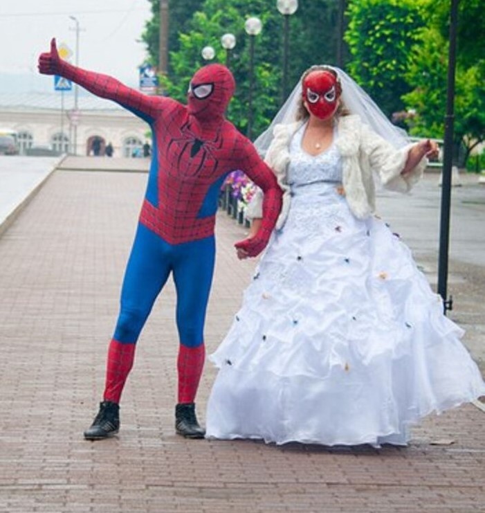 Первый пример — жених, который явно является фанатом Человека-паука. Его костюм ярко-красного цвета и уникальные детали привлекают внимание, однако невеста решила не отставать и присоединилась к теме, выбрав белоснежное платье с аксессуарами в стиле комиксов. Двойная доза супергеройской романтики!