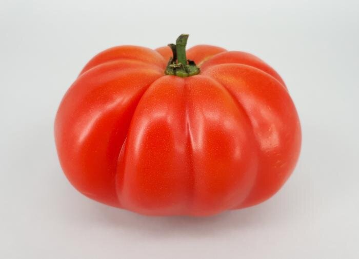- Томат "Рубиновый Кубок" — детерминантный сорт высотой 90-100 см, с крупными плодами между 180 и 300 грамм. Эти малосемянные помидоры прямо-таки притягивают внимание благодаря своей плотной структуре и слегка ребристой форме.