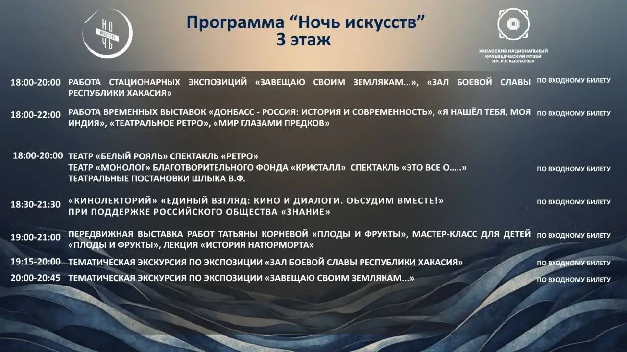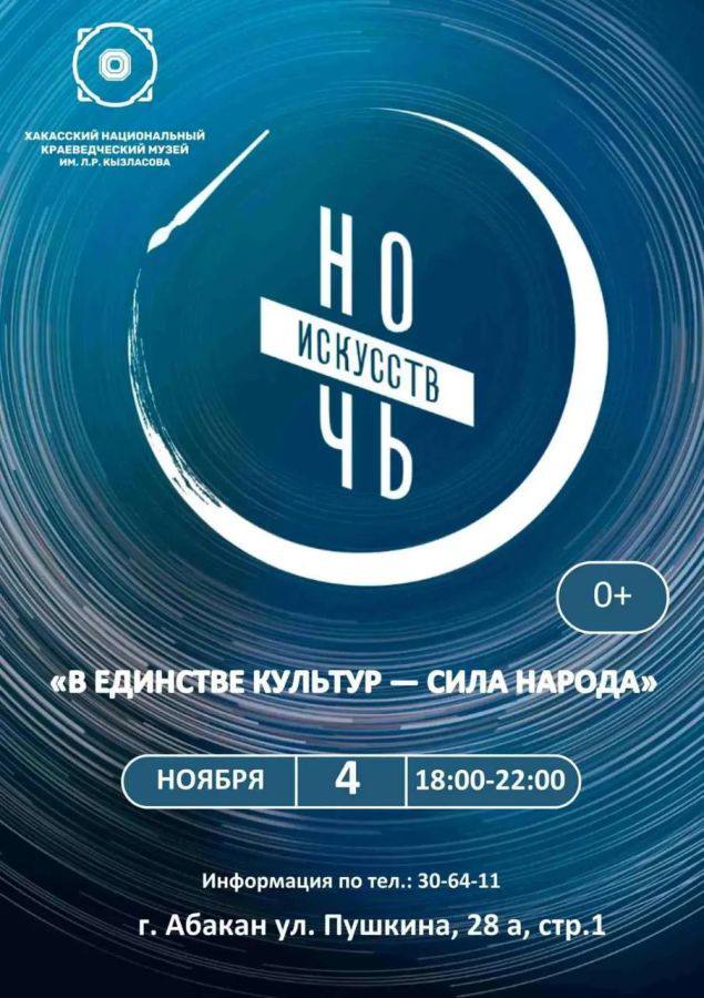 4 ноября с 18:00 до 22:00 в Хакасском национальном краеведческом музее имени Л.Р. Кызласова пройдет Всероссийская акция «Ночь искусств» – это волшебное время, когда искусство оживает, история раскрывает свои тайны, а культурные пространства наполняются особенной атмосферой.