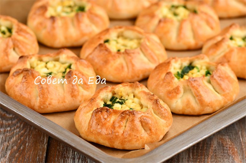 Зеленый лук обжаривается в растительном масле, после чего к нему добавляются яйца. Эта начинка должна быть не только вкусной, но и сочной. Разделите тесто на 12 кусочков, раскатайте в лепешки е добавьте начинку, после чего защипите края. Пирожки смазываются яйцом и отправляются в разогретую до 180 °C духовку на 20 минут.