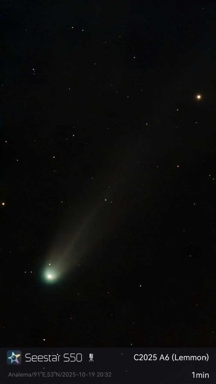 На этот раз в её объектив попала «хвостатая гостья» под научным именем «C/2025 A6 (Lemmon)», она наблюдается в созвездии Гончие Псы, под Ковшом Большой Медведицы недалеко от яркой звезды Арктур - над ней комета пролетит 21 октября,- уточняют астрономы.