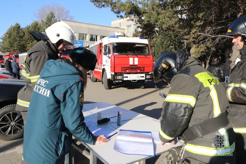 Сотрудники МЧС тренировались на объекте с массовым пребыванием людей - административном здании "Россетей".По легенде, в архиве возник пожар. Цокольный этаж оказался задымлённым (использовали театральный дымогенератор).Сработала сигнализация...
