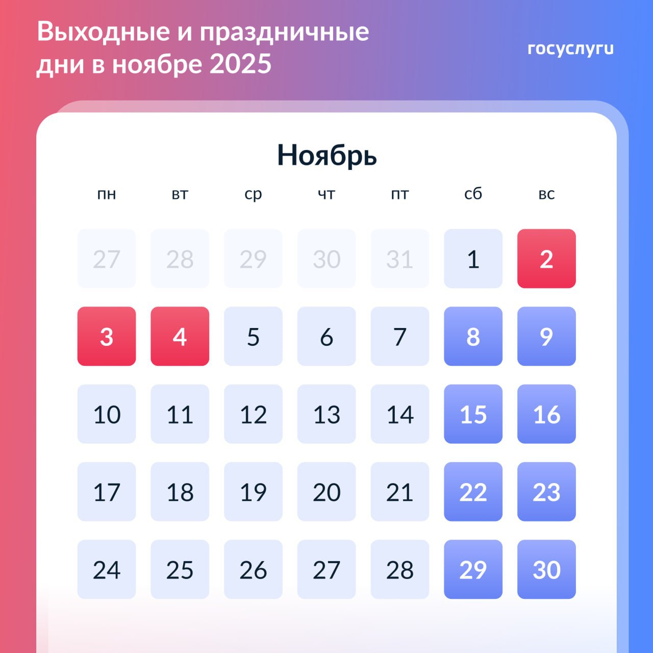 Официальный телеграм-канал портала «Госуслуги» дал разъяснение о рабочих и выходных днях в ноябре.