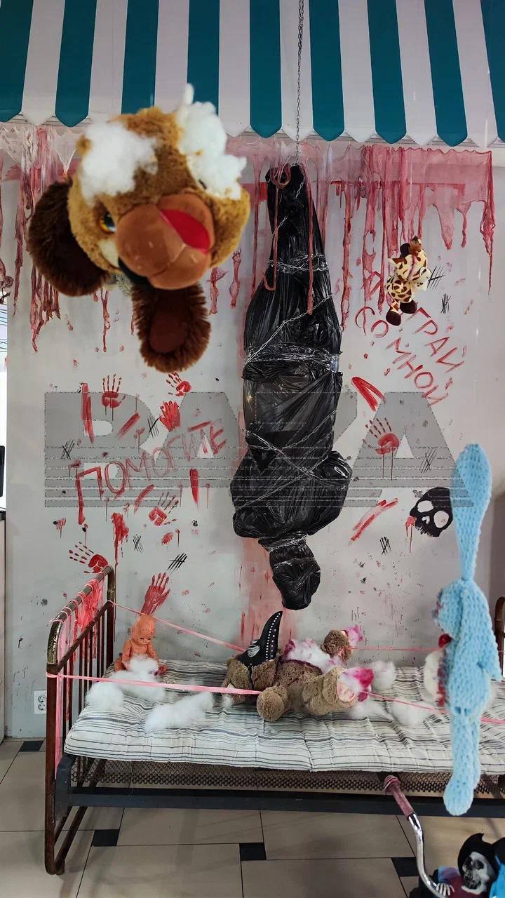 Адскую инсталляцию с трупом устроил детский центр в Абакане к Хеллоуину — кроша повесили, Мишке оторвали голову, окатили пупса кровью.