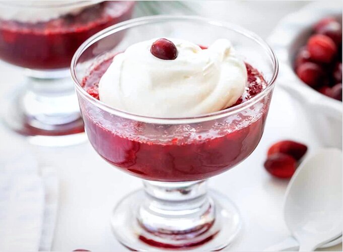 Когда клюквенное желе готово, в каждую креманку добавляется большая ложка сливочного крема, создавая эффект «снега» на красном желе. Данный десерт можно подавать сразу или хранить в холодильнике до момента подачи.