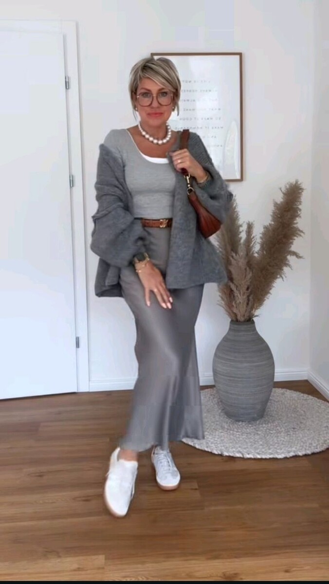 - Монохромный уют: Неповторимый образ в серых тонах включает приталенную юбку-макси из шелка, свободную футболку с глубоким вырезом и теплый кардиган. Белые кроссовки добавляют яркость и динамику, придавая комплекту оригинальности.