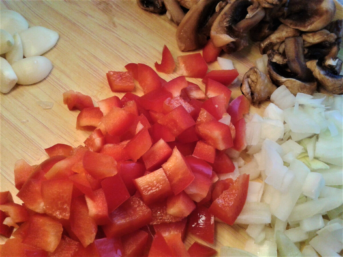 Приготовление блюда начинается с тщательной подготовки овощей. Репчатый лук нарезается кубиками, сладкий перец также измельчается, а чеснок раздавливается. Грибы можно оставить целыми или нарезать, в зависимости от предпочитаемой текстуры.