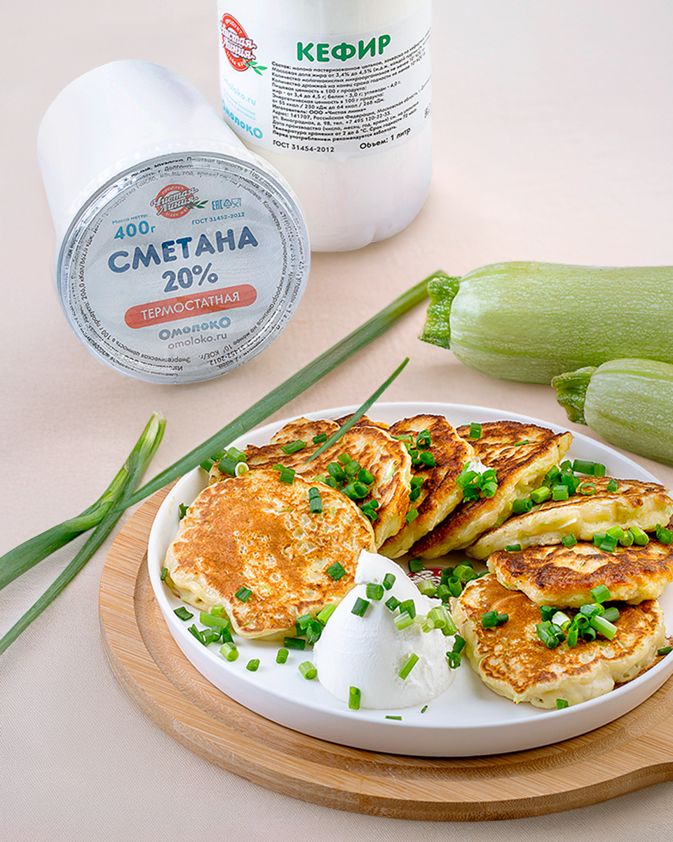 Подготовка кефира: Нагрейте кефир в сотейнике на маленьком огне в течение 5 минут. После того, как он станет теплым, добавьте соду и перемешайте.Подготовка теста: Натерите кабачки на мелкой терке. Добавьте яйца, мелко нарезанный лук, муку и немного черного перца. Хорошо перемешайте получившуюся массу.Соединение компонентов: Влейте теплый кефир в смесь и смешайте до однородного состояния.Жарка оладий: Нагрейте сковороду с небольшим количеством растительного масла. Выкладывайте порции теста на сковороду и жарьте оладьи на среднем огне.Доведение до готовности: Как только на поверхности появятся пузырьки, переверните оладьи и продолжайте жарить до золотистой корочки.Подача: горячие оладьи подаются с густой сметаной от «Чистой Линии». Наслаждайтесь этим лакомством в кругу семьи и друзей!