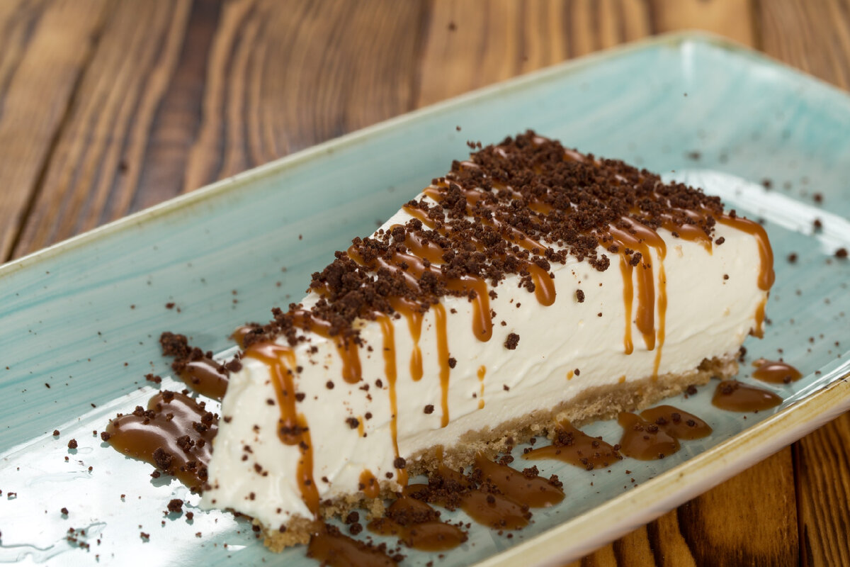 Чизкейк с карамельным сиропом и кусочками шоколада: этот десерт сочетает в себе гармонию вкусов, которые не оставят равнодушным ни одного гурмана. Нежная, воздушная текстура сырного крема, сладкие ноты карамели и шоколадные акценты делают этот чизкейк идеальным выбором для любого торжества.