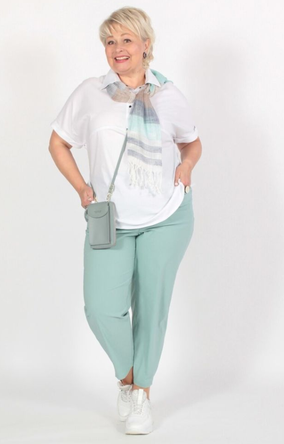 - Легкость и комфорт: Идеальный летний комплект может состоять из прямых брюк мятно-бирюзового оттенка и свободной футболки. Добавить нотки шарма поможет легкий шарф, аккуратно обвязаный на шее. Обувь в виде удобных кроссовок станет оптимальным завершением образа.