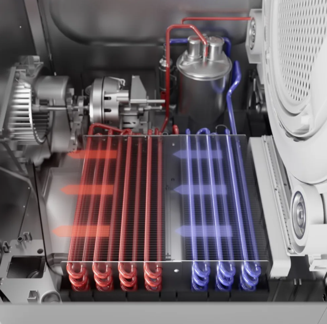 Конденсационные сушилки работают благодаря принципу конденсации. Влажный воздух из барабана проходит через теплообменник, где его температура понижается, и влага превращается в конденсат. Этот конденсат собирается в резервуаре или может быть отведен в канализацию. Воздух, который уже отдал свою влагу, повторно нагревается и возвращается в барабан, что создает замкнутый цикл, значительно экономя энергию.