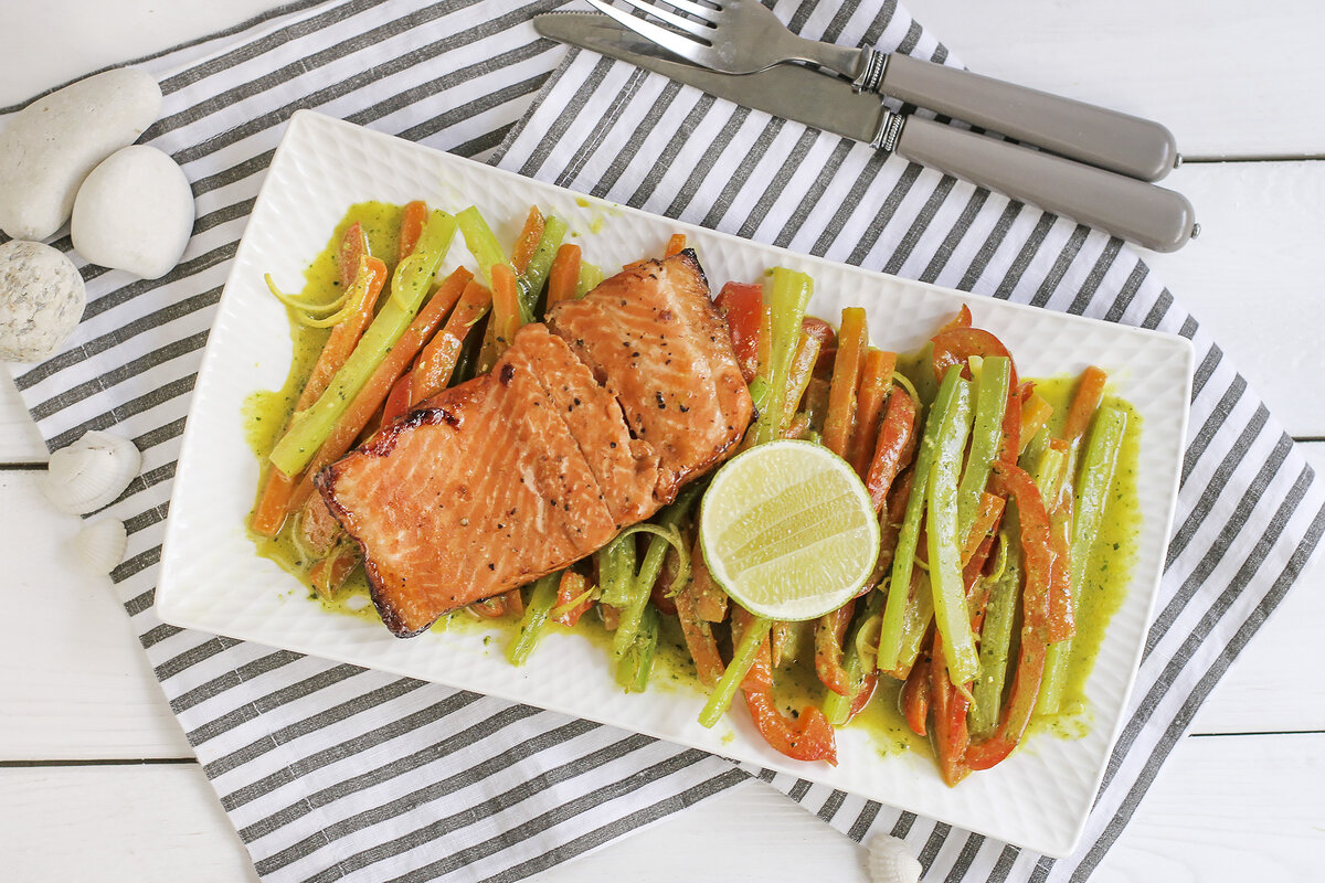 Шаг 2: Параллельно подготавливайте овощи. На сухой сковороде обжарьте очищенную и нарезанную соломкой морковь, добавив 200 мл воды, куркуму, сахар и щепотку соли. Через 10 минут добавьте рожки из сельдерея и нарезанный перец, а также мелко нарезанный чеснок и сливочное масло. Готовьте еще 5 минут. Затем добавьте тертую цедру лайма, а готовые овощи щедро перемешайте с соусом песто. Сразу же подавайте форель с овощами, сбрызнув лаймовым соком для освежающего акцента.