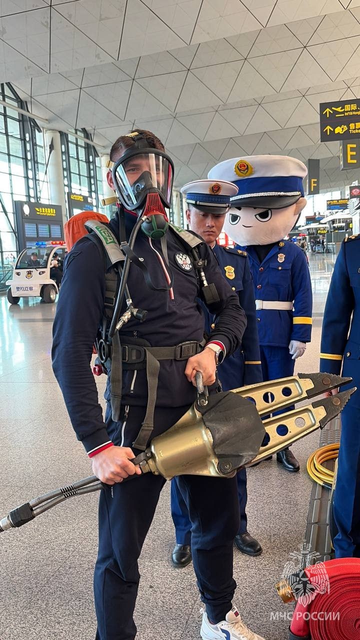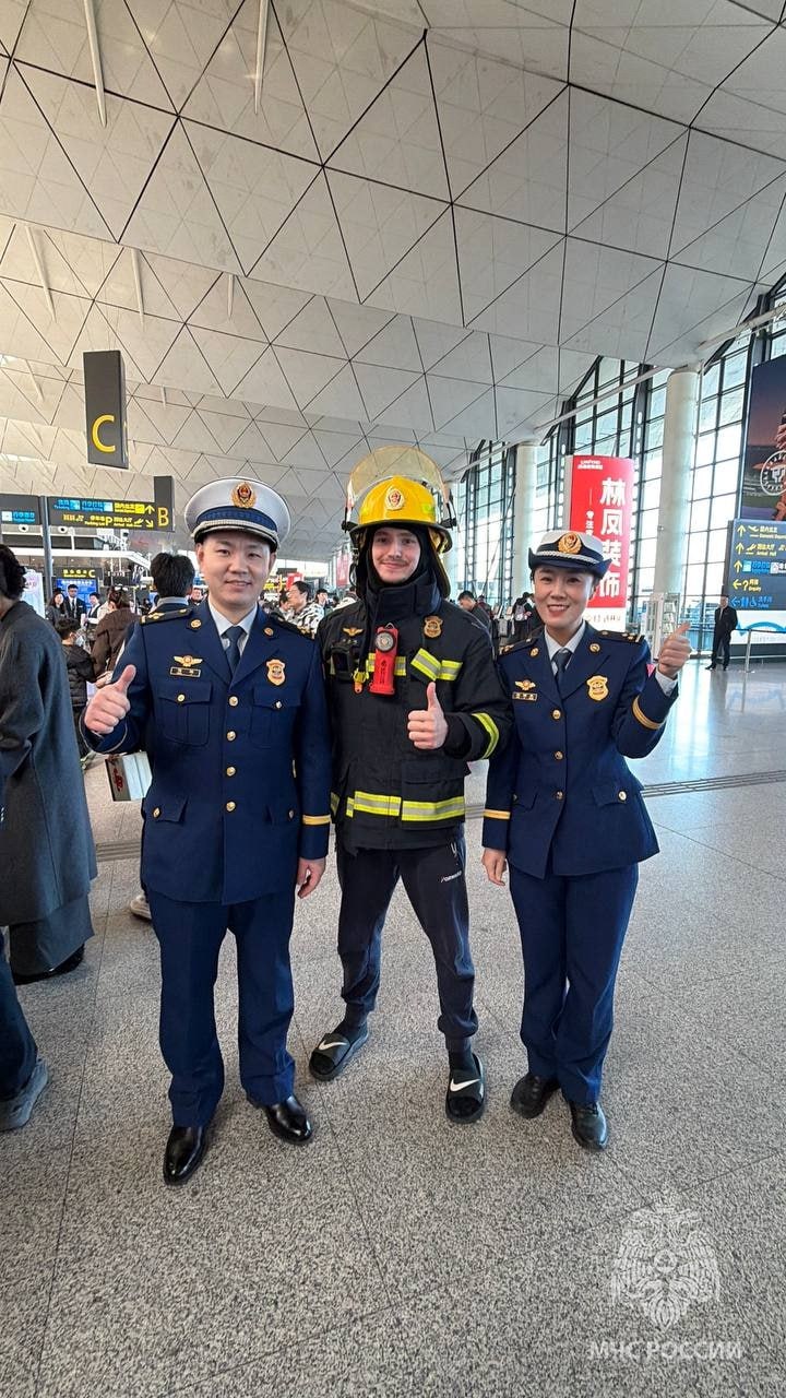 В аэропорту Фёдор встретил китайских коллег, примерил боевую одежду, подержал гидравлический инструмент и оценил соединение пожарного ствола с рукавом!