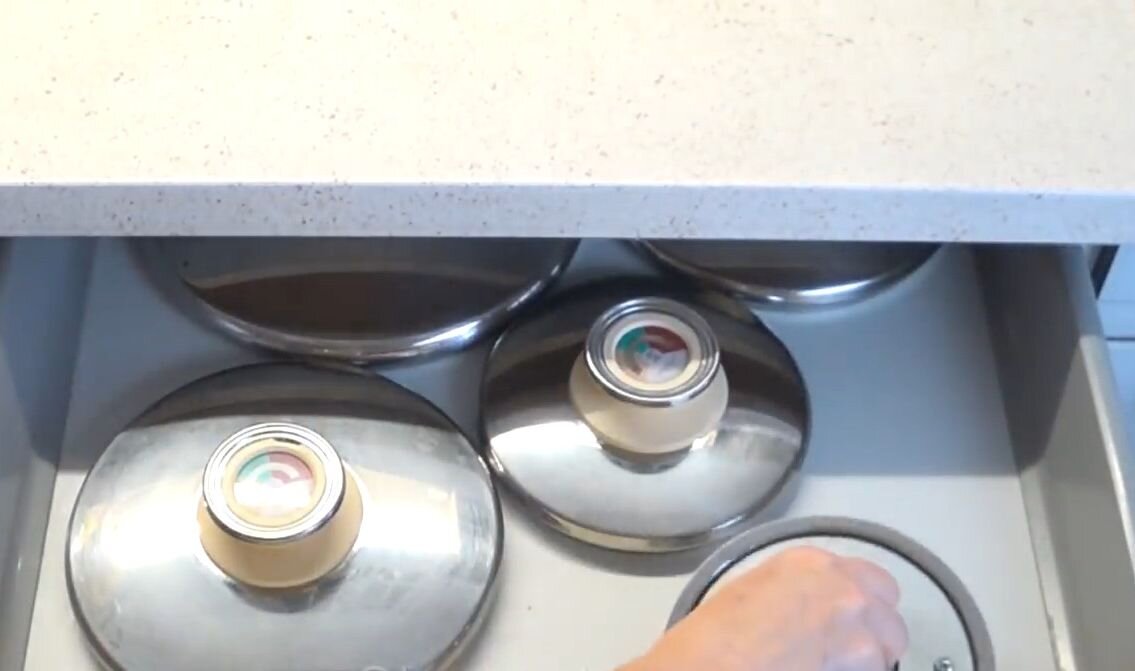 - Выдвижные ящики. При проектировании кухонной мебели стоит подумать о наличии низкого, но широкого выдвижного ящика. Это идеальное место для хранения крышек, ведь их легко доставать и размещать обратно. Если вы выбираете готовую мебель, важно убедиться, что в ней предусмотрено подобное отделение.