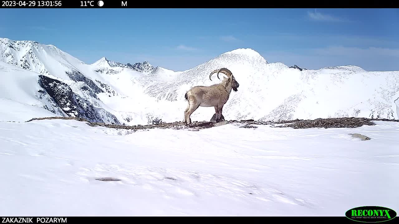 Заснеженные вершины, залитые лучами солнца, чистейшее небо и местный обитатель, задумчиво глядящий на бесконечные просторы заповедной территории