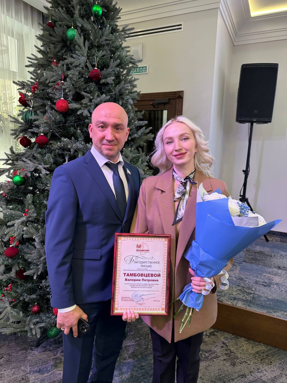 От имени регионального парламента он вручил Благодарственное письмо пресс-секретарю Министерства спорта республики Валерии Тамбовцевой. Награда присуждена «За значительные заслуги в содействии и реализации государственной политики в области физической культуры и спорта».