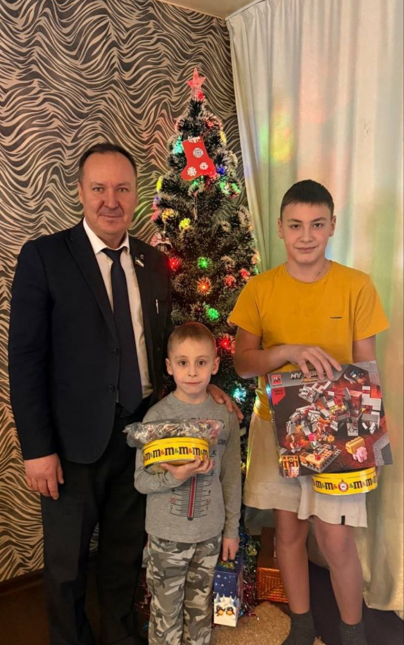 К акции присоединился и депутат Верховного Совета Хакасии Константин Летуев. Он исполнил новогоднюю мечту двух братьев из села Новоенисейка Бейского района. Их отец погиб при выполнении задач в зоне СВО. Мальчики попросили у Деда Мороза конструкторы — и получили долгожданные подарки и сладости.