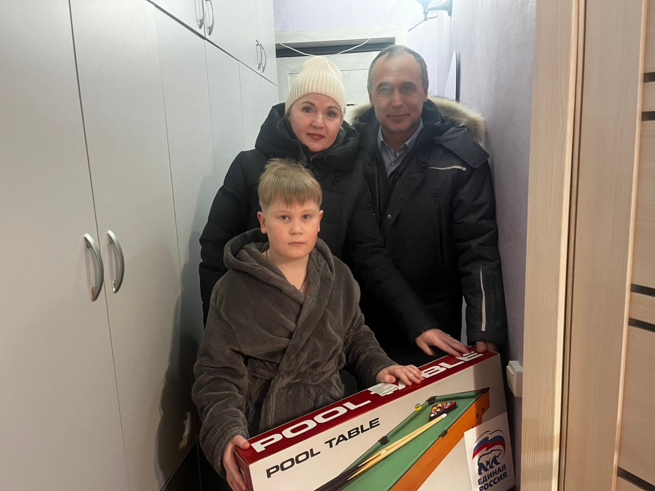 В Сорске к акции подключились представители местного отделения партии «Единая Россия». Первое желание уже сбылось: секретарь отделения, депутат Верховного Совета Хакасии Александр Масалов подарил Ивану Нечаеву из семьи участника СВО набор для настольного бильярда.