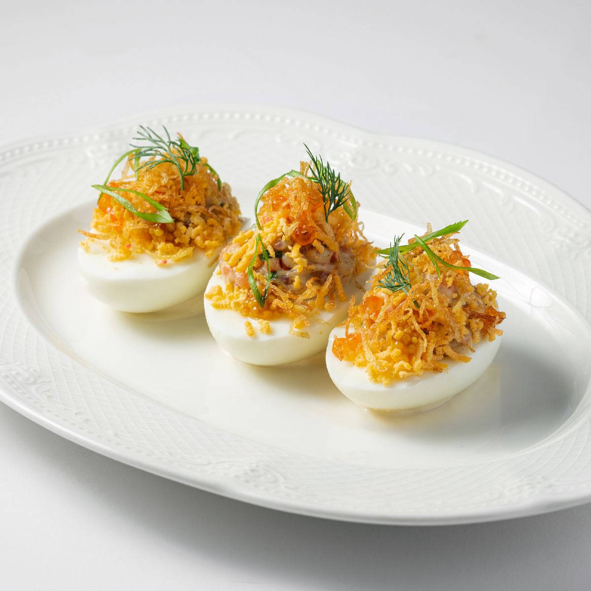 Пришло время собирать нашу закуску: начинку выкладываем в половинки белков, выкладывая их на красивую тарелку. Украшение придаст блюду оригинальности: добавьте немного укропа, красную икру, хрустящий картофель пай, щепотку желтка и несколько капель трюфельного масла для финального штриха.