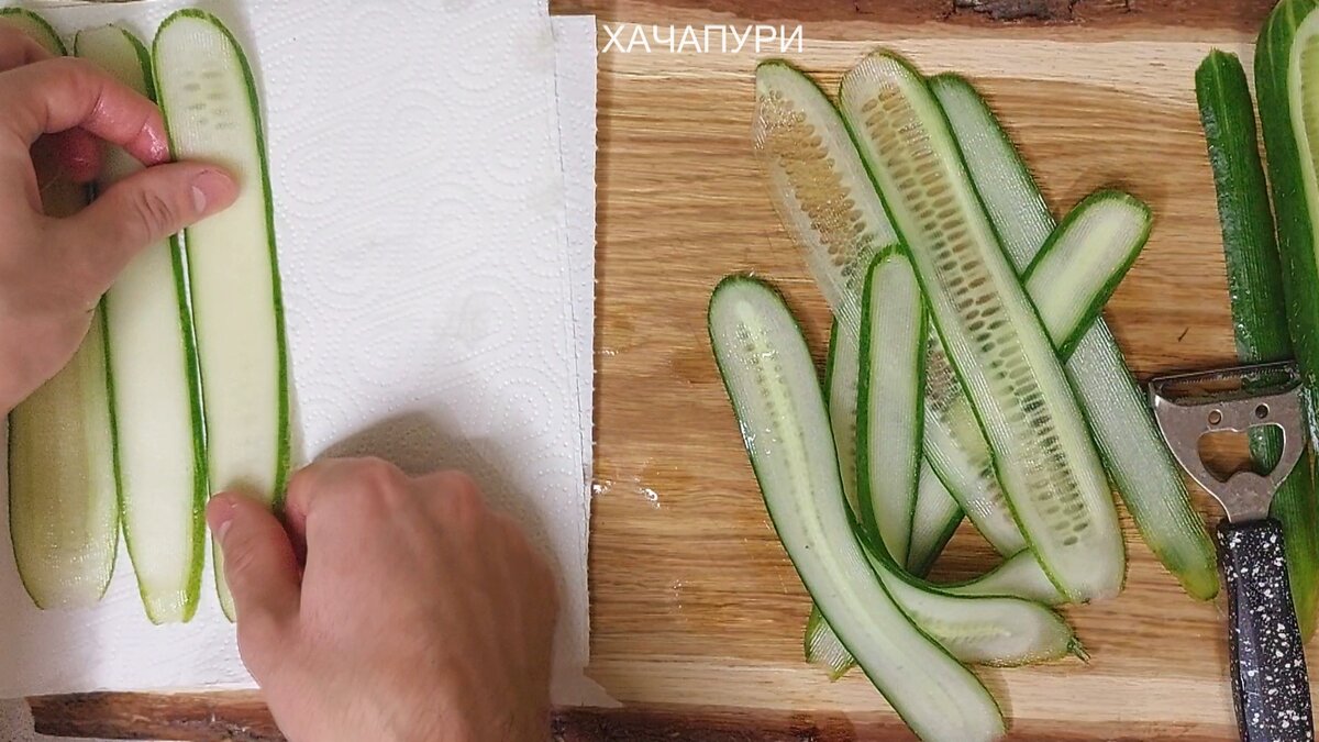 Для начала, огурцы следует нарезать на тонкие слайсы с помощью овощечистки. Готовые ломтики нужно выложить на салфетку, чтобы избавиться от лишней влаги. Далее подготавливаются яйца — их следует отварить вкрутую, а свеклу можно использовать уже готовую, либо приготовить самостоятельно.