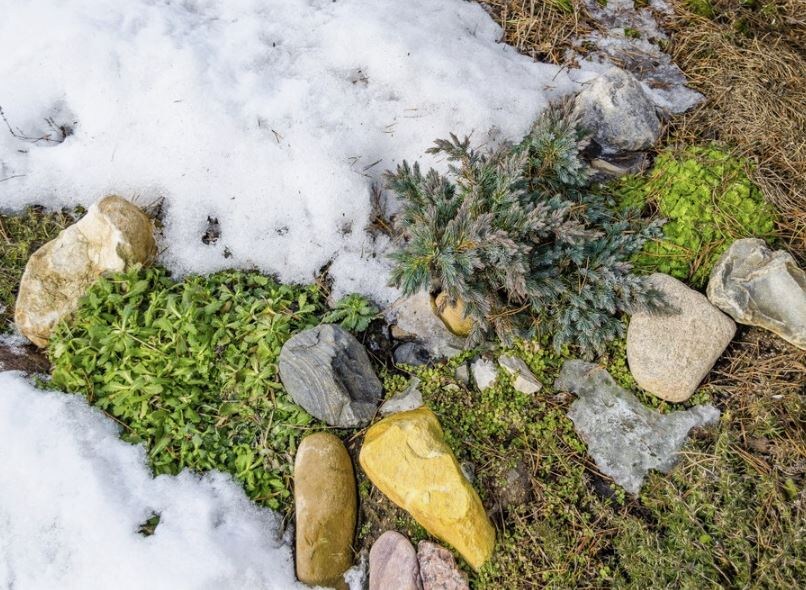 Специалисты также советуют для склонов использовать хвойные ветки в качестве «снежного каркаса». Это поможет задерживать снег и защитит растения, а также предотвратит смещение камней.