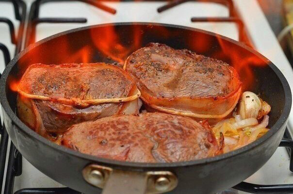 На предварительно разогретую сковороду с оливковым маслом помещают мясо. Важно не двигать его, чтобы образование корочки было идеальным. С обеих сторон говяжьи медальоны жарятся около двух минут; для любителей более проделанной говядины время жарки можно немного увеличить.