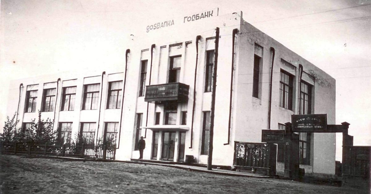 Наиболее ровные и сухие возвышенности района Национального банка были недоступны частым разливам рек Абакана и Енисея. Поэтому район быстро застроился и вскоре представлял собой центр города. Здесь было построено здание Хакасского окружного исполкома, здесь была размещена пожарная часть и построена первая в городе электростанция. В этом районе в 1931 году начато строительство первого каменного здания в городе, Хакасской областной конторы Госбанка.» (Л.И. Белоусова, «Первые улицы г. Абакана в 1920-1930 годы»).