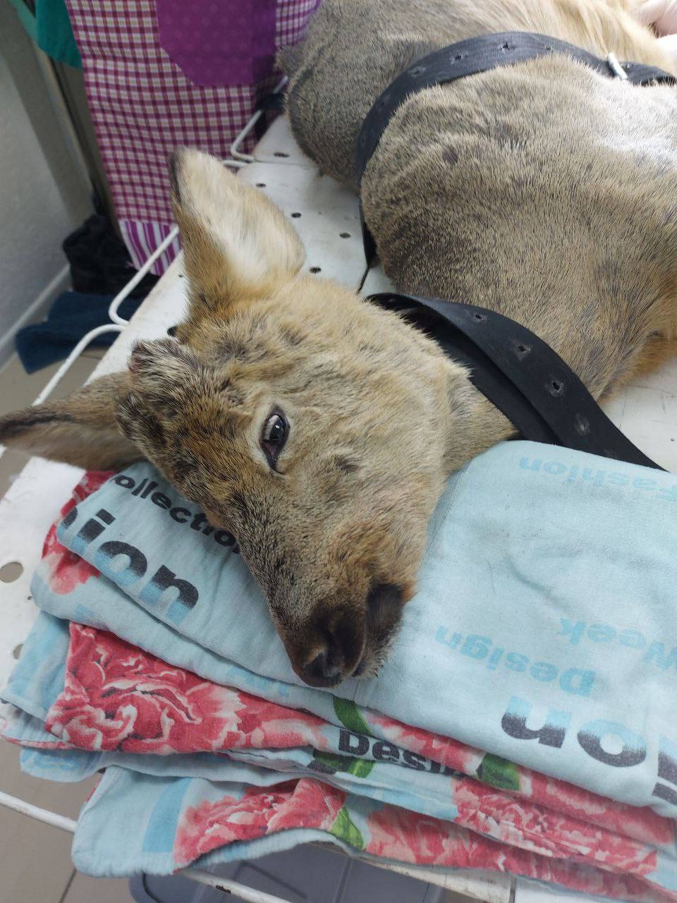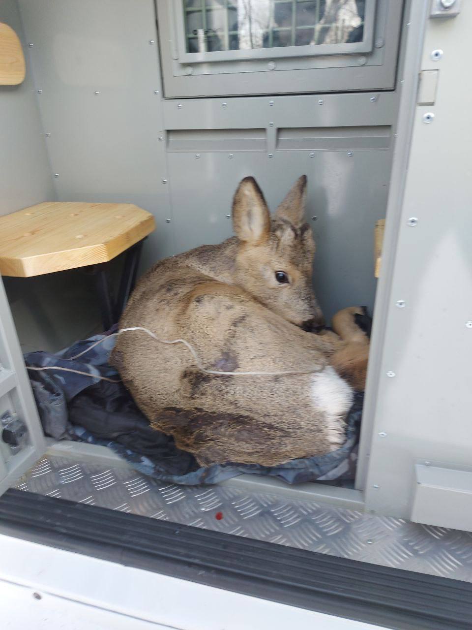 Прибывшие сотрудники ППС обнаружили, что животное ранено. Они погрузили испуганную косулю в патрульный автомобиль и доставили в ветклинику.