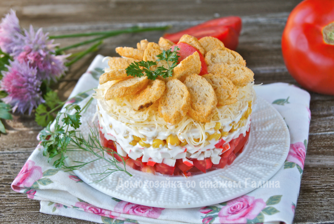 Салат с крабовыми палочками — это не только вкусное, но и эффектное блюдо, которое станет настоящей звездой любого праздничного стола. Его оформление и яркие цвета привлекут внимание ваших гостей с первой минуты.
