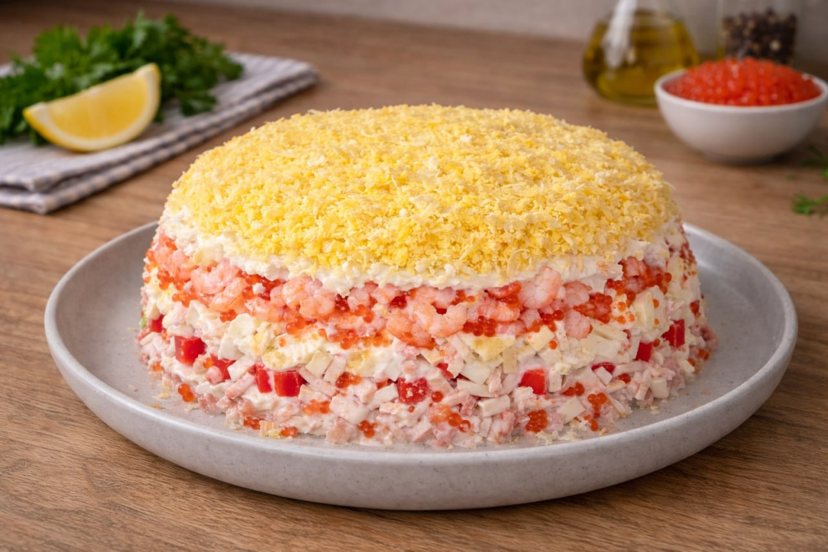Приготовление этого салата не потребует значительных усилий, что делает его идеальным выбором для семейных встреч и уютных праздников. Сочетая морепродукты с нежными яичными белками и изысканной красной икрой, становится очевидным: даже простое блюдо способно произвести фурор на столе.