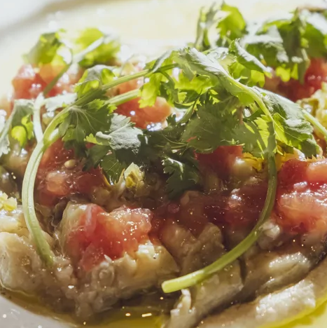 Следующий этап — создание овощной сальсы: свежий помидор, небольшой кусочек чили, кинзу и репчатый лук нарезать кубиками. Заправляется эта смесь лимонным соком и оливковым маслом. Для подачи на стол на тарелку выложить кунжутный соус, запеченные баклажаны, а сверху добавить овощную сальсу. Яркий цвет и свежесть ингредиентов сделают это блюдо не только вкусным, но и настоящим украшением стола.