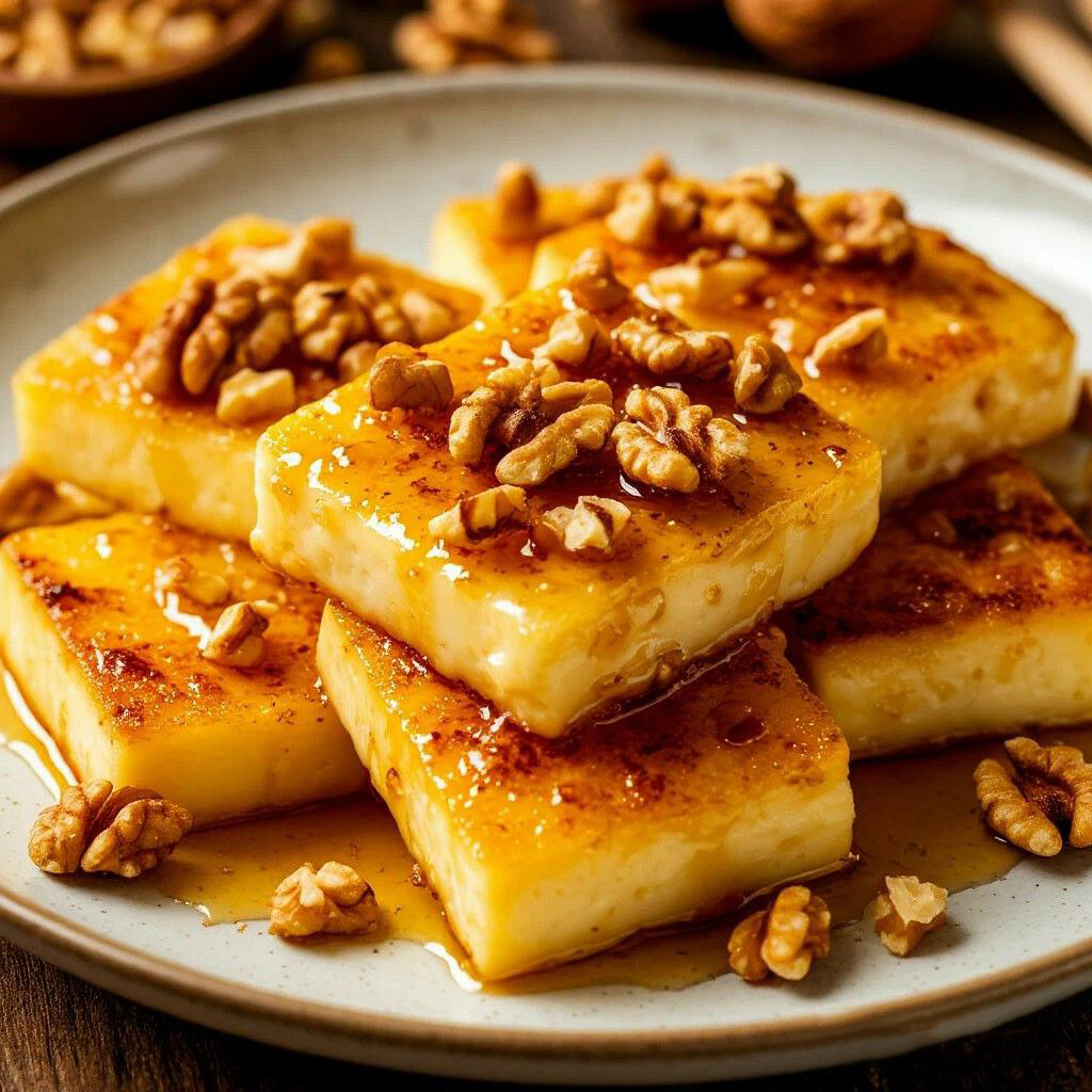 3. Подача: Переложите горячий сыр на тарелку, полейте медом, посыпьте дроблеными грецкими орехами и при желании добавьте специи.
